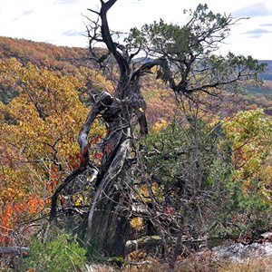 In the Arkansas Ozarks, Ashe’s juniper is primarily found on the dry, steep, south- and west-facing slopes of limestone-dolomite glades in northern counties of the Ozark Plateau. They also occur on bluff tops and ledges along the White River, the Buffalo River, and other Ozark streams. Some of the bluff top junipers are hundreds of years old because these sites are especially inaccessible, and because the scrubby, gnarled growth-form of Ashe’s juniper makes it of little commercial value. The Central Interior Highlands Calcareous Glades that support this tree are a natural community of conservation concern.