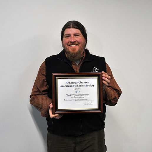 At the 2017 Annual Meeting of the Arkansas chapter of the American Fisheries Society, Jason Throneberry, ANHC Aquatic Ecologist, received an award for his presentation titled “Current Status and Habitat Use of the Foushee Cavesnail.”
