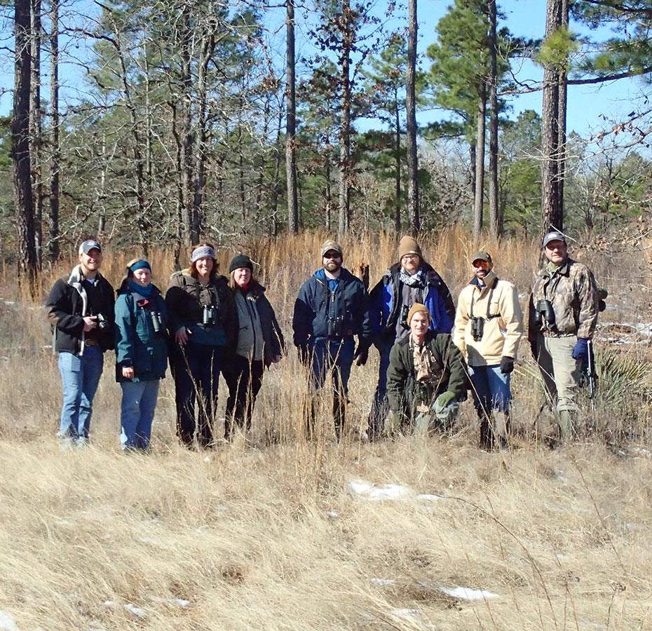 Knowing that he would be hosting a tour for the Audubon members, Holimon also invited staff members from the National Wild Turkey Federation, Arkansas Game and Fish Commission, Quail Forever, and the U.S. Fish and Wildlife Service, Arkansas Field Office to watch the Henslow’s sparrows with The Connecticut Audubon members. Afterward, partners stayed to tour the natural area and discuss collaborative restoration opportunities. Despite the chilly temperatures, everyone seemed to enjoy the visit to the natural area and watching the birds.