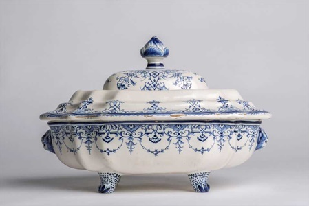 Of particular grandeur is the French faience tureen, used for soups and stews. Molded with lion mask handles and raised on four feet with a dot and foliate design, with stylized foliage, strapwork and hatched designs border the dish, and is topped with a fruit form knop on the dome of the lid.