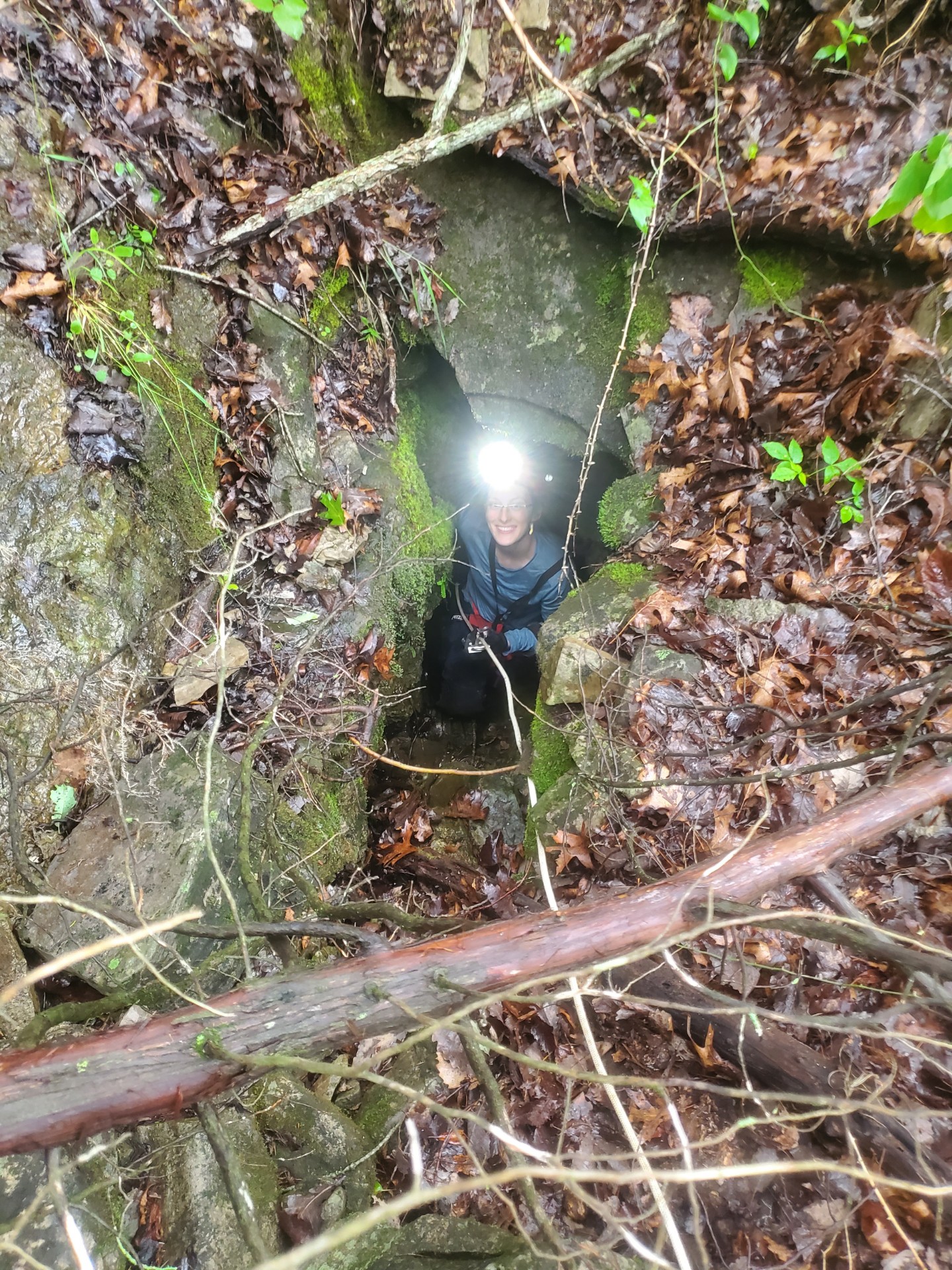 The opening that Roberts and Spotts were searching for is tiny (see photo at left, by Emily Roberts), but with Soteropoulos’ directions, they located it. The “pit” only went down about 40 feet at a slant, classifying it as a cavelet. A cavelet is a small opening large enough for a human to enter, but too small to be classified as an actual cave. Cavelets are formed by the same natural geological processes as caves. Roberts was able to climb into the cavelet and explore it. As a result of the ANHC’s partnership with the Cave Research Foundation (CRF), two other cavelets and a larger cave, Devil’s Knob Cave, have been located, surveyed, and mapped at Devil’s Knob-Devil’s Backbone NA. The ANHC has been partnering with the CRF since 2019 to study, protect and preserve cave resources and karst areas on our natural areas. CRF volunteers have provided ANHC staff with technical support, and training in mapping and biological inventories of karst features. Seven of the ANHC’s natural areas have known caves: Cave Springs Cave, Devil’s Eyebrow, Devil’s Knob-Devil’s Backbone, Foushee Cave, Garrett Hollow, Hell Creek, and Slippery Hollow.