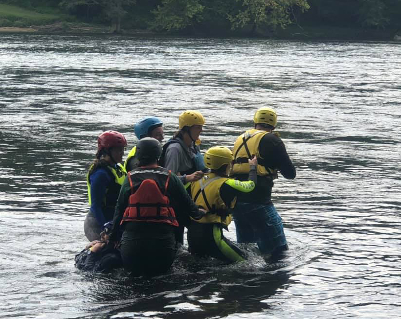 Tom coordinated with Entergy to request a water release authorization for the day of the training, which allowed students to safely navigate the white-water portions of the river. The day started with a few hours of classroom material at the park pavilion where Tom discussed risk assessment and safety considerations like proper personal protective equipment and the dangers of hypothermia. When air temperatures rose, the classroom moved to the water where students practiced swimming at a 45 degree angle through swiftwater currents. Tom encouraged students to familiarize themselves with the power of the currents and the relief of eddys -- an area where the current varies from the rest of the river.