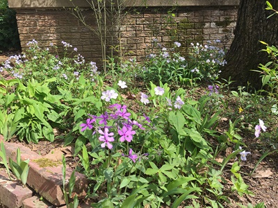 Photo 2 — This mesic forest garden with dozens of spring ephemeral wildflowers is on the same site as the dry woodland bed but required careful site selection (finding spots with maximum shade), soil amendments to increase fertility and water retention, application of shredded leaf mulch, and regular irrigation during the sumer and fall. Photo by Theo Witsell.
