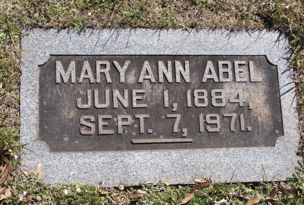(https://www.findagrave.com/memorial/164436439/mary-ann-abel: assessed 21 October 2021, memorial page for Mary Ann Abel (1 June 1884 - 7 Sep 1971) Find A Grave Memorial ID 164436439, citing Forest Hill Cemetery, Birmingham, Alabama. Maintained by Ed Stallings (contributor)