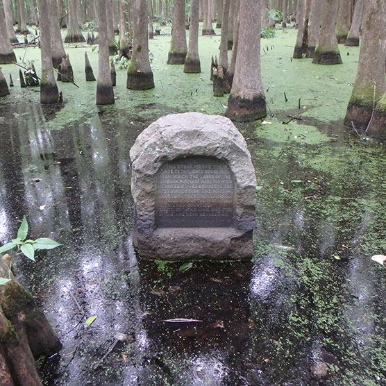 Main photo — Monument and headwater swamp at Louisiana Purchase Historic State Park-Natural Area. Photo by Bill Holimon.