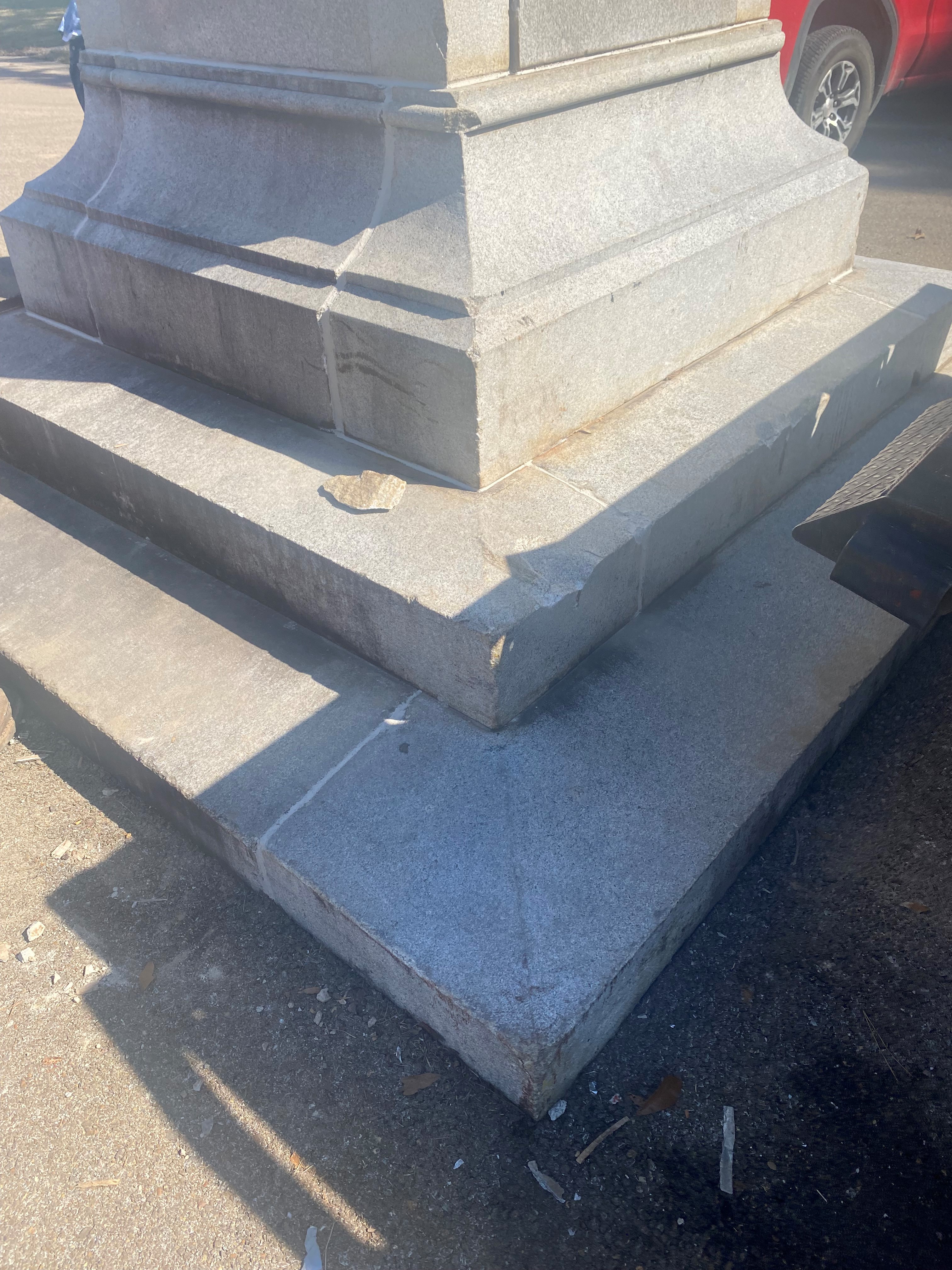 Ms. Mitchell and St. Charles Police Chief Jamie Irons also sent along photographs showing the repaired monument base. Visible in one was a large stone flake, possibly from the edge of one of the steps. Ms. Mitchell confirmed this. Her reply put the flake, and what had caused it, in historic context: