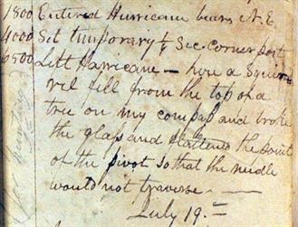 Photo 1 and Main Photo — Excerpt of original GLO notes from 1834 from the Little River bottoms near present-day White Cliffs Natural Area in Little River County, Arkansas. The surveyor describes entering a "Hurricane," an archaic term for a tornado track of downed trees. Upon leaving the tornado track, the surveyor writes that "here a squirrel fell from the top of a tree on my compass and broke the glass and flattened the point of the pivot so that the needle would not traverse." Someone also scribbled in the margin "fine places for hunting" (perhaps plotting some revenge on squirrels?).