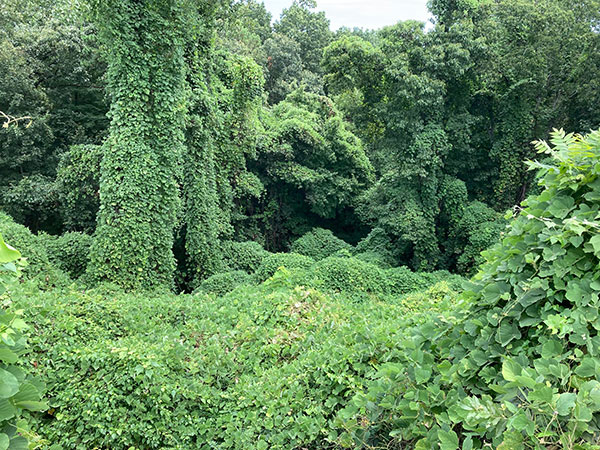 Photo 2 and Main Photo — Kudzu (Pueraria montana) spreading throughout an area, growing on the ground and up and around a tree. Photo by Theo Witsell.