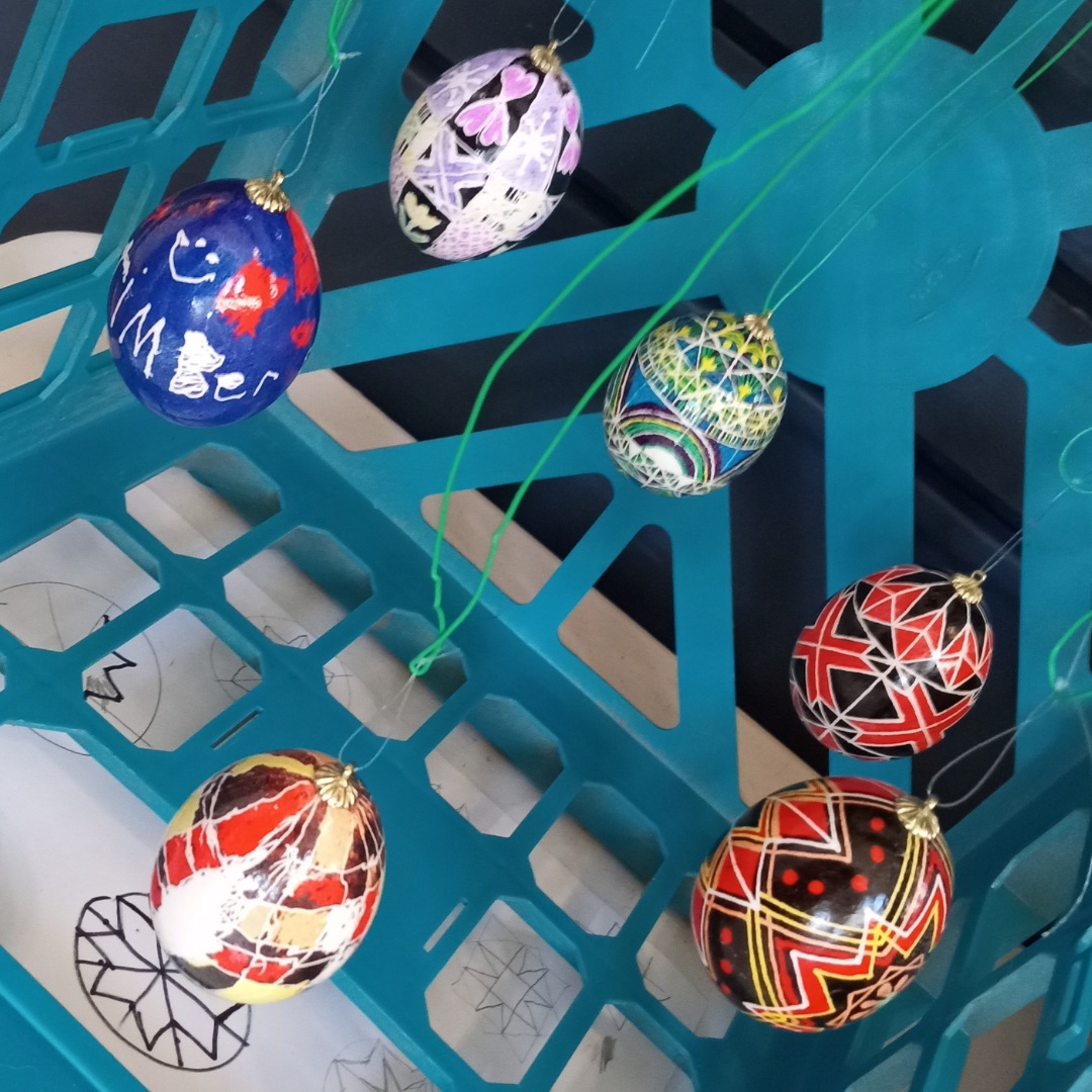 During the week, participants took time to look at a variety of egg colors and sizes. Participants learned the basic wax resist process of dyeing the eggs by making two with old designs. Then, they each found contemporary Psyanka patterns which were discussed to find the best way to be used. For the last egg the participants made, everyone created and produced their own unique design with colors they picked.