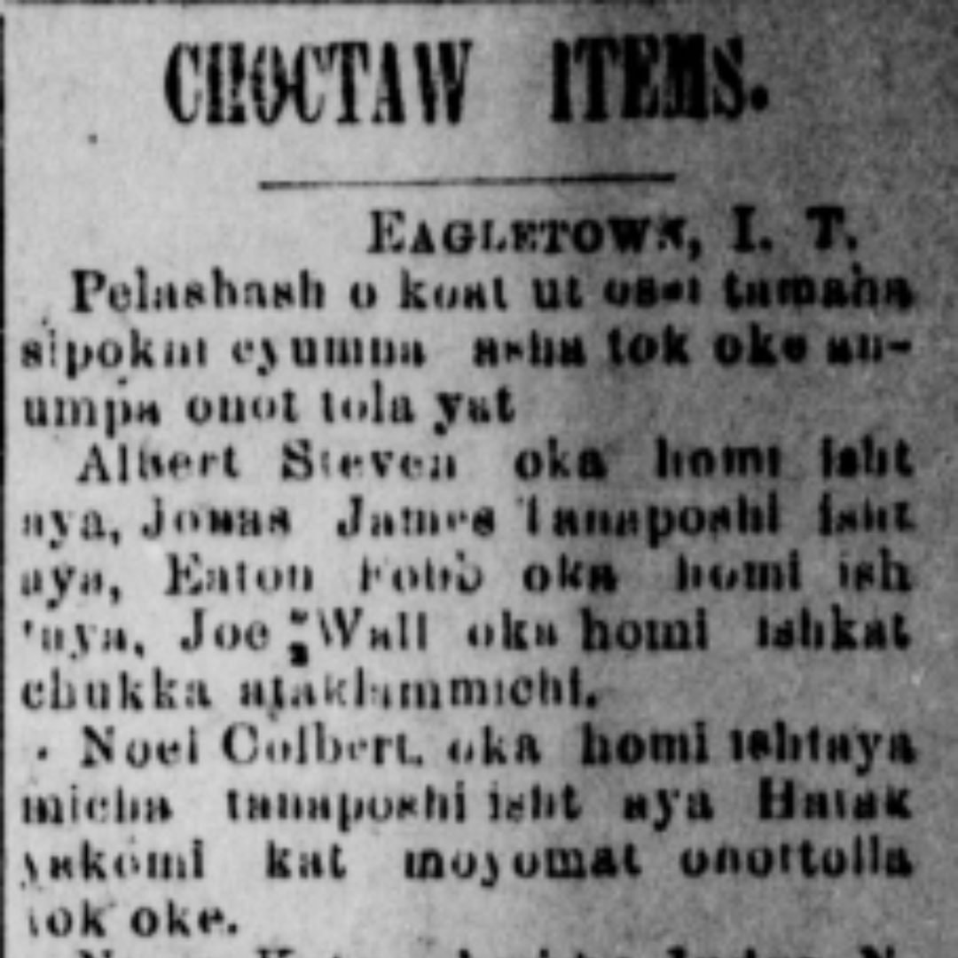 It is my opinion this trip solidified the relationship between the people of Eagletown and the publishers of the De Queen Bee. The first Choctaw language content to appear in the De Queen Bee was a front-page article on October 8, 1897. The “Choctaw Items” columns were first published in Choctaw and repeated in English. The column was much like any other small, rural town news at the time, reporting on the weather, people that are coming and going, general business dealings, court cases and community events. Similar articles appeared again in the October 15 and November 5 issues from 1897. While news of Eagletown and other Indian Territory communities continued to be reported in the paper, it wasn’t until January 6, 1911 that another column was published in Choctaw. And like with the previous columns, it covered general happenings in the town.