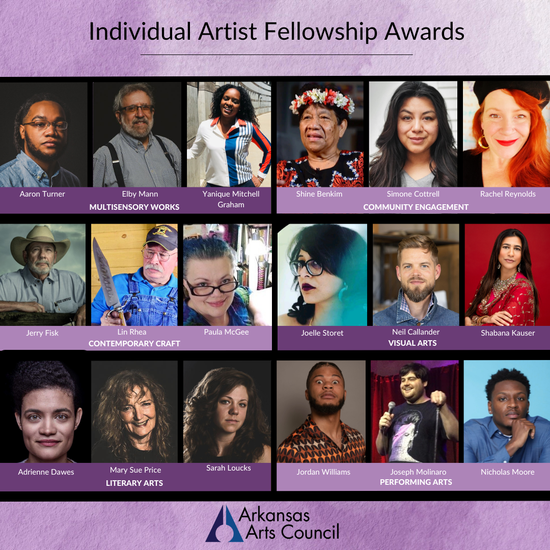 “We know that supporting individual creatives will not only translate into the preservation of Arkansas arts, culture, identity and heritage but will also continue to contribute to the growth of the overall economy through tourism and a creative workforce,” said Marty Ryall, director of Arkansas Heritage. “The Individual Artist Fellowship award program is unique because it is statewide, and it allows the recipients to use funding to meet basic or ongoing needs. No other state or regional entity offers a grant like this.”