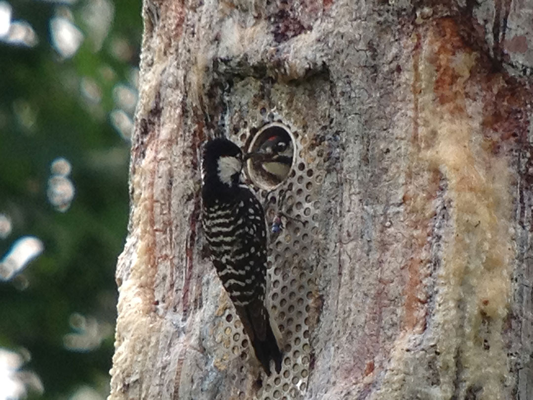 Unlike most woodpeckers in our area that nest and roost in dead trees or the dead portions of trees, the RCW makes its home within live pine trees. The RCW meets the challenge of excavating in live pines by preferentially selecting trees with red-heart fungus (Phellinus pini). The fungus speeds up decay of the heartwood of pines, making it easier for RCWs to create a cavity chamber. The RCWs are dependent on older trees (typically over 60 years old) because they have a higher frequency of red-heart fungus and are large enough for a cavity chamber.