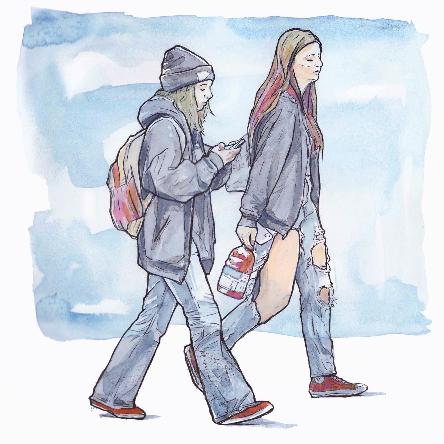 Display image of "Girls," in watercolor, ink and gouache on paper, by Kasten Searles of Little Rock, 2024 Small Works on Paper.