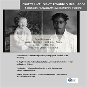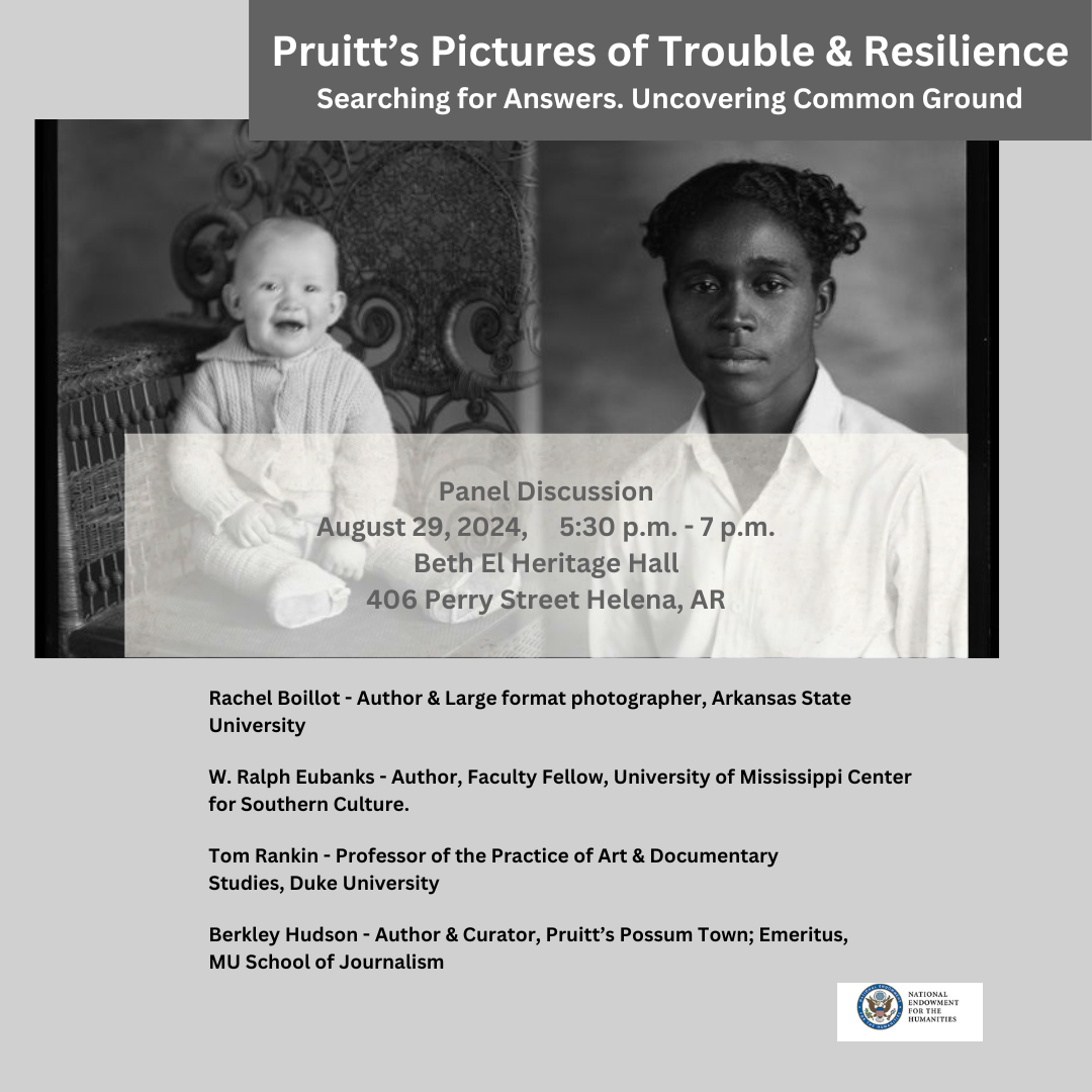 The Delta Cultural Center will host an informative Panel Discussion on Thursday, August 29, 2024, at the Beth El Heritage Hall, located at 406 Perry Street in Helena. This will be followed by a special night viewing of Mr. Pruitt’s Possum Town: Photographing Trouble and Resilience in the American South in the central gallery at the DCC Visitor Center located at 141 Cherry Street in Helena-West Helena, Arkansas. This event will begin at 5:30 p.m. with an expected ending at 7 p.m.
