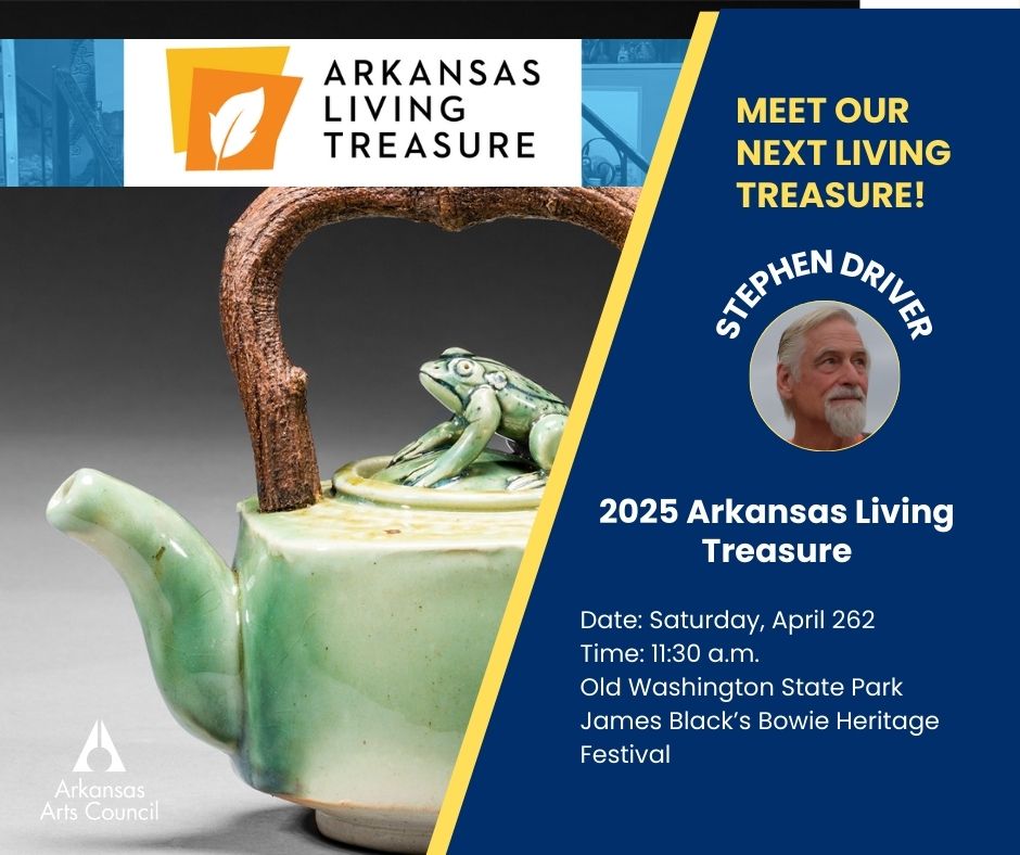 Join us at 11:30 a.m. Saturday, April 26, for the announcement and artist talk by this year's Arkansas Living Treasure, potter Stephen Driver, at the James Black's Bowie Heritage Festival at Old Washington State Park.