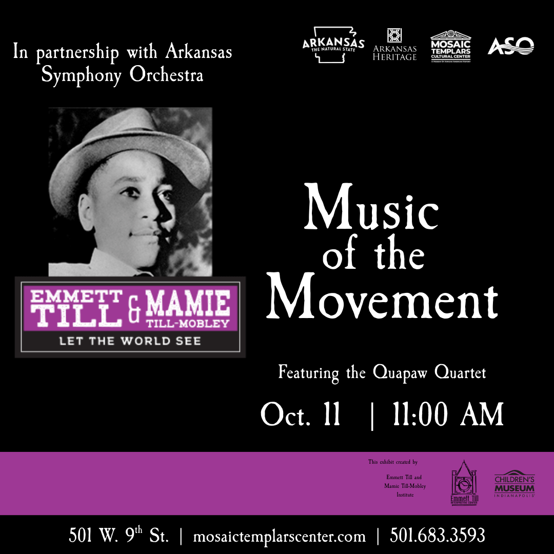 Experience the power of music as the Arkansas Symphony Orchestra’s Quapaw Quartet presents Music of the Movement—a stirring program featuring spirituals, freedom songs, and classical works that reflect the struggle and strength of the Civil Rights era. Presented in partnership with MTCC as part of the Emmett Till & Mamie Till-Mobley: Let the World See exhibit.
